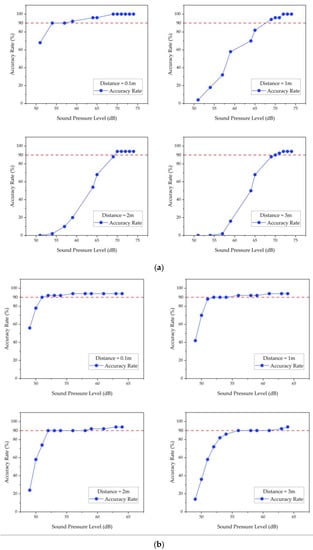 (a) Recognition results for the alarm sound. (b) Recognition results for the water flow sound. The red dashed line in the figure represents a recognition accuracy of 90%.