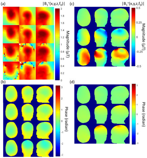 - Collins, C.M.; Liu, W.; Wang, J.; Gruetter, R.; Vaughan, J.T.; Ugurbil, K.; Smith, M.B. Temperature and SAR calculations for a human head within volume and surface coils at 64 and 300 MHz. J. Magn. Reson. Imaging 2004, 19, 650–656. [Google Scholar] [CrossRef] [PubMed]