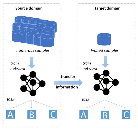 The biggest drawback of deep learning models is their heavy dependency on the availability of data. In particular, in many industrial environments, the collection and labeling of required data is expensive and time consuming. In turn, there are many settings where only a limited amount of training data are available. This widespread issue of data scarcity led to the emergence of research fields that aim to find approaches able to cope with a small amount of training data. Examples of corresponding approaches include few-shot learning, data augmentation, and transfer learning (TL). The concept of TL is illustrated by Figure 1. TL denotes the process of utilizing the information created when solving a task in order to solve a similar but distinct task.