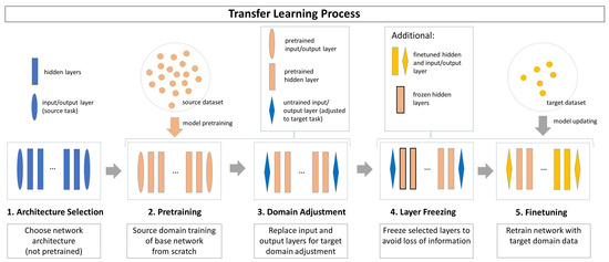- Step 5 (Finetuning): The network is retrained on the target task with the target domain dataset. Usually, the target dataset has only a limited number of instances. The resulting model includes information from both the source domain and the target domain.
