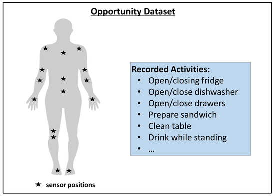 The Opportunity dataset was published to examine and compare human activity recognition algorithms, including TSS. It includes sequences created by tracking a number of human subjects via body-worn, object-attached, and ambient sensors (like accelerometers or location sensors). The sequences are annotated by activity labels. It is a popular and widely used dataset in the literature (e.g., [26,38]) that has often been used for benchmarking time series-based approaches. The dataset can be structured into two parts, i.e., the ADL (Activities of Daily Life) section and the Drill section. The ADL section just follows the subjects accomplishing daily life activities (including relaxing and eating) and, in turn, often has longer time periods without a change in the activity label. In the Drill section, however, the subjects were told to perform several short activities (e.g., open doors) without any breaks in between. The activity labels, therefore, are rapidly changing, resulting in a setting that is more similar to the HPEoL dataset, in which many label switches are present within a short period of time. Figure 5 shows the location of different sensors during the data collection process.