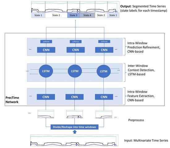 All source tasks and target tasks investigated in this paper belong to the category of supervised TSS tasks. More precisely, we target to find and train a deep learning model to enable it to predict the state labels for all timestamps of a multivariate time series. This is called dense labeling. The network architecture we use to analyze the impact of TL in this work is called PrecTime. The PrecTime architecture was introduced in 2022 in one of our previous works [6]. It is designed for multivariate TSS and was already successfully applied to the HPEoL dataset and Opportunity dataset in isolation. As the output of the network is a sequence of state label predictions (one per time stamp), it is considered a sequence-to-sequence model. The conceptual backbone of the network is illustrated in Figure 6. PrecTime is a time window-based architecture consisting of three modules, i.e., a CNN-based intra-window feature extractor, an LSTM-based inter-window context detection, and a CNN-based intra-window prediction refinement model. The concrete details about the architecture, implementation, loss functions, and hyperparameters are described in [6]. They were reused in this paper.