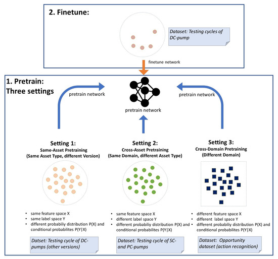 Ref. [15] compared different TL approaches for anomaly detection based on pump vibration data. In turn, ref. [31] used already outdated data for pretraining their network to boost the prediction accuracy compared to a cold-start network. Results were verified on two industrial datasets (solar, furnace). Another approach combined both few-shot learning and TL techniques to overcome the issue of a small training set in rotatory machine fault detection; [7,8] used a huge general-domain dataset to train the feature extractor of a CNN, before finetuning the classificator with the small target dataset to diagnose gear faults. Ref. [32] analyzed whether TL can help to identify bearing defects by transferring learned features across data of different working conditions. The authors could show that their proposed TL approach increases the effectiveness of vibration-based fault detection models. Staying in the area of vibration-based bearing fault detection, another contribution provided an analysis of how and to what extent discriminative information found in varying settings (different sensor locations or working loads) can be transferred between networks [33]. In turn, ref. [34] investigated online fault detection of pumps and motor bearings and achieved high accuracy by creating a transfer convolutional neural network compared to classic models. Finally, ref. [35] was able to show that the deep TL network created with a domain adaptation module outperformed other approaches in a piston pump fault detection use case.