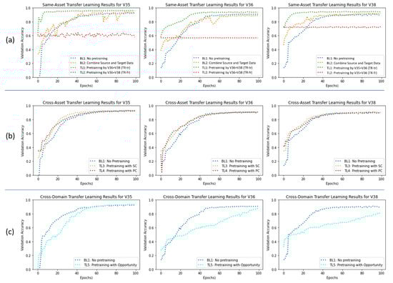Training process comparison for different settings, all with a target training set of size 3: (a) Setting 1: Same-asset transfer learning T1 (unfrozen) and T2 (frozen) compared to two baselines BL1 and BL2, (b) Setting 2: Cross-asset transfer learning T3 (SC pretraining) and T4 (PC pretraining) within same domain compared to baseline BL1, (c) Setting 3: Cross-domain transfer learning T5 (Opportunity pretraining) compared to baseline BL1.