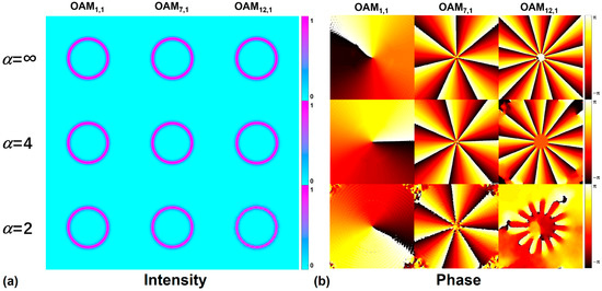 (a) Intensity and (b) phase distributions of the OAM1,1, OAM7,1, and OAM12,1 modes in the RCF with α = 2, 4, ∞, respectively.