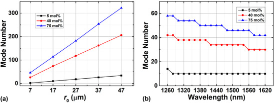 OAM mode number supported in the fiber as a function of (a) the position of the ring-core (r0) and (b) wavelength with different mole fractions of GeO2.