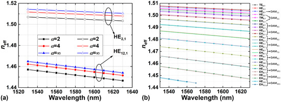 (a) Effective refractive indices of the HE2,1 and HE12,1 modes with α = 2, 4, ∞; (b) effective refractive indices of the eigenmodes when α = 2.