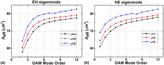 The effective mode area (Aeff) as a function of the mode order is shown in Figure 5 with different shape factors (α = 2, 4, ∞) under the radially single-mode condition. Aeff is defined as [49]: