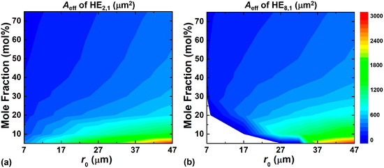 Effective areas of the (a) HE2,1 and (b) HE8,1 modes with α = 2 under different mole fractions of GeO2 and the position of the ring-core.