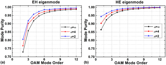 Purity of the (a) EH-composed and (b) HE-composed OAM modes with different shape factors.