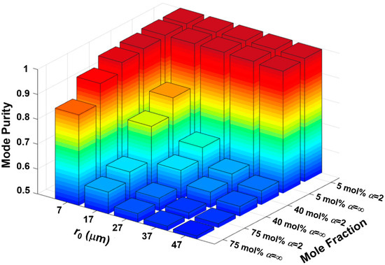 To further observe the effect of spin-orbit interaction and verify the purity enhancement by alleviating the index discontinuity, we calculate and compare the mode purity of HE-composed OAM1,1 with different GeO2 mole fractions and ring-core positions under different shape factors, as shown in Figure 8. As mentioned above, the high GeO2 mole fraction will introduce strong SOC, which means that the effect of GIP on SOC will be particularly obvious. Therefore, we can see that the purity of the OAM1,1 can be promoted significantly under a higher GeO2 mole fraction.