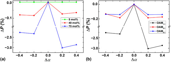 Considering the defects introduced into the index profile during the fabrication process, a perturbation type of calculation for shape factor α is analyzed when r0 = 7 μm. The purity deviation of the OAM mode (ΔP), as a function of shape factor error (Δα) from α = 2, is displayed in Figure 9. The mode purity for α = 2 is used as the reference, and ΔP represents the deviation between the OAM mode purity under α + Δα and the reference. Figure 9a shows that ΔP of OAM1,1 varies with Δα under three GeO2 mole fraction cases, and Figure 9b depicts that ΔP of different OAM modes varies with Δα. As shown in Figure 9a, under the 5 mol% and 40 mol% GeO2 mole fractions, the deviation of the OAM mode purity could be <0.1% when the shape factor error is within ±0.4, respectively. In addition, the deviation of the OAM mode purity could be <0.2% in high-order OAM modes when the GeO2 mole fraction is 75 mol%. Therefore, by selecting proper GeO2 concentration and OAM modes with higher order, the fabrication tolerance could be further increased.