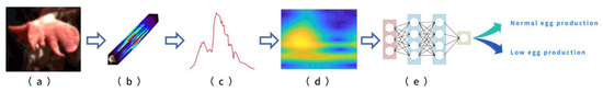 Flow chart of the experiment: (a) hyperspectral image; (b) spectral cube; (c) spectral curve of combs; (d) wavelet transform feature map; (e) convolutional neural network. The spectral data were obtained from the hyperspectral image to establish the spectral cube, and the one-dimensional spectral characteristic curve of the comb was extracted. The two-dimensional feature map was generated by FCWT and input into the convolutional neural network to obtain a two-classification model that can recognize normal- and abnormal-laying hens.
