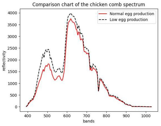 In conclusion, there is no relevant, intelligent identification technology to identify laying hens with low-egg production. It is also difficult to apply the relevant technologies that are currently applied to intelligently distinguish between sick and dead laying hens or between laying hens with low-egg production and high-egg production. The external characteristics and behaviors [13] of laying hens with high- and low-egg production are distinct due to differences in the reproductive functions of laying hens during the laying period. High-egg-production laying hens typically have bright red, elastic combs and beards, while low-egg-production laying hens have lusterless, relatively pale combs. High-egg-production laying hens also tend to have combs that are relatively large and primarily inclined to one side, while those of low-laying hens are dried, shrunken, and smaller. In the review mentioned above, some researchers have adopted image recognition and machine vision algorithms to classify healthy chickens, dead chickens, and sick chickens based on the color and shape differences of chicken combs in various health states. We assume that, since the combs of these two laying hens differ visibly, the hyperspectral imaging of their combs should also differ in accordance with the fundamentals and features of hyperspectral imaging. This distinction can then, in return, be used to easily distinguish between laying hens with high- and low-egg production. Based on the above assumptions, this study is devoted to the development of a model to achieve the high-precision recognition of laying hens with normal- and low-egg production by analyzing the spectral data collected by hyperspectral sensors. At the same time, we try to present a new general method for analyzing and processing hyperspectral data, which provides important research value for the application of hyperspectral technology in other fields.