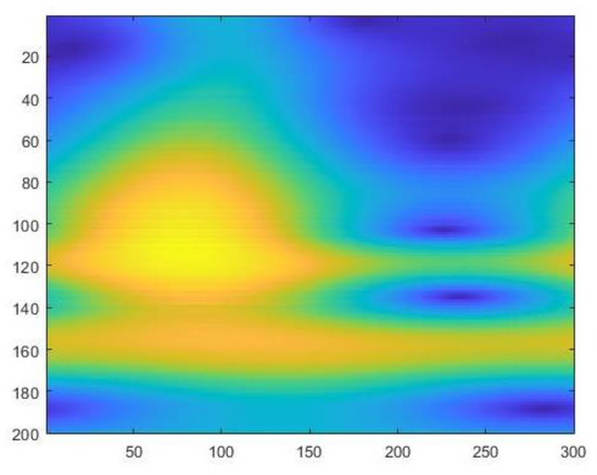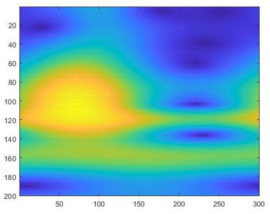 The feature matrix is obtained after using the wavelet transform by sequentially stacking the wavelet coefficient W obtained by each scale on n scales. FCWT converts the spectral curve from a one-dimensional version to a two-dimensional hyperspectral feature map. A 200 × 300 matrix makes up each two-dimensional hyperspectral feature map. It is a two-dimensional spectral feature map of combs from chickens with low-egg production and a two-dimensional spectral feature map of combs from chickens with normal-egg production, as shown in Figure 4 and Figure 5 below.