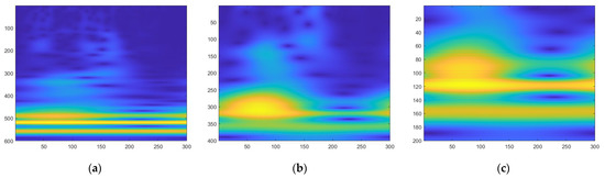 Wavelet transform images under different scales and have different graphic results; choosing the appropriate scale is helpful to the mining of signal details: (a) image at scale , = 12; (b) image at scale , = 8; (c) image at scale , = 10.