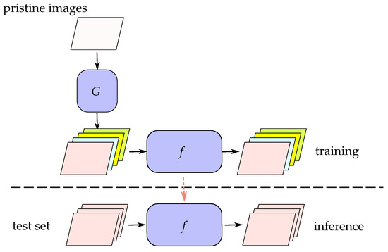 Previous methods of fake sample syntheses. The pristine images are used to generate fake images based on color jitter, resizing, sharpening, and translation using a fake image synthesizer G. The orange dashed line represents the use of trained weights during the inference stage.