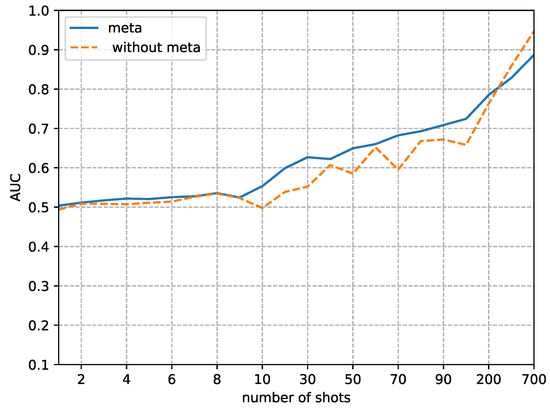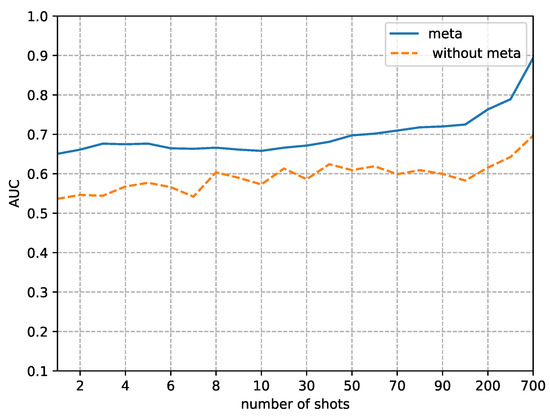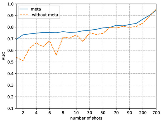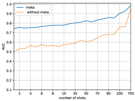 The second phenomenon we observe from Figure 8, Figure 9, Figure 10 and Figure 11 is that our method’s performance is consistently superior to not using our method when the fine-tune size K is less than 700. When the sample size reaches 700, the performance of not using our method to detect and quickly improves, approaching the performance of our method. This result implies that the proposed method is more efficient in the case of small fine-tuned datasets than the method with random initial weights. As the size of the fine-tuned set K increases from 1 to 700, the advantage of the initial weights obtained by meta-learning slowly decreases.