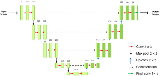 In this work, we replace the standard classification discriminator with the U-net based discriminator. The U-net is an encoder–decoder architecture that consists of a network of convolutional layers, and skip connections for semantic segmentation [33,34,35]. It was initially proposed for biomedical image segmentation, which achieved precise segmentation results with few training images. Further, it demonstrates good results in other applications, including geo-sciences [36], remote sensing [37], and others. Its architecture (see Figure 1) is symmetric and consists of two paths: an encoder that extracts spatial features from the input image (downscaling process), and a decoder that constructs the segmentation map from the extracted feature maps (upscaling process). The use of U-net architecture in the proposed model adds major advantages: (1) it enables the simultaneous use of the global location and context while predicting masks; (2) it retains the full context of the input images, which is a significant advantage over patch segmentation approaches [38].
