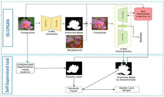 Formally, we define as the source image containing the foreground object, and denotes the set of input images. Further, we create a pseudo label denoted by , using an unsupervised segmentation algorithm. Then, we define as the pixel-wise segmentation mask produced by the decoder of the discriminator. Hereafter, we optimize the overall discriminator loss function (Equation (5)) by augmenting a new self-supervision loss (Equation (4))