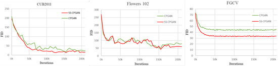 FID training curves for CPGAN and SS-CPGAN on the datasets: CUB2011, Flowers 102, and FGCV).