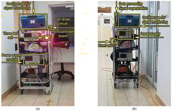 - Umair, M.A.; Meucci, M.; Catani, J. Strong Noise Rejection in VLC Links under Realistic Conditions through a Real-Time SDR Front-End. Sensors 2023, 23, 1594. [Google Scholar] [CrossRef] [PubMed]