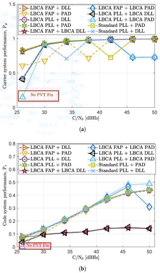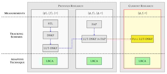 Figure 1 shows the relation of relevant research on LBCA-based techniques. First, the implementation of the LBCA in tracking schemes with only one measurement has been studied. From the STL [31,34,37,38,39] to more advance tracking schemes such as the DSKF [24] and the LUT-DSKF [25]. Second, the research has been recently expanded by implementing the LBCA in tracking schemes with two measurements. Recent research implements an adaptive LUT-DSKF in a FAP tracking architecture [26]. The derivation of the discrete algebraic Riccati equation (DARE) of this tracking architecture presents an inter-dependency between FLL and PLL coefficients. Only one LBCA can adapt the LUT-DSKF’s response time based on the found inter-dependency. This architecture has been also evaluated under simulated controlled fading scenarios [40]. Furthermore, recent studies show the tracking performance of the LBCA under simulated moon exploration missions [41].