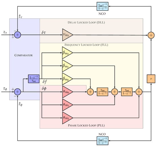 Figure 2 shows the linear model of the discrete full LUT-DSKF tracking architecture, which consists of three main components: the comparator, the loop filters (i.e., for DLL, FLL, and PLL), and the NCO. The comparator is the innovation stage of the DSKF (see Equation (18)), and the rest of the modules perform the state prediction and update of the DSKF (see Equations (19) and (20)). The steady-state Kalman gains are the loop filter coefficients (see Equation (22)).
