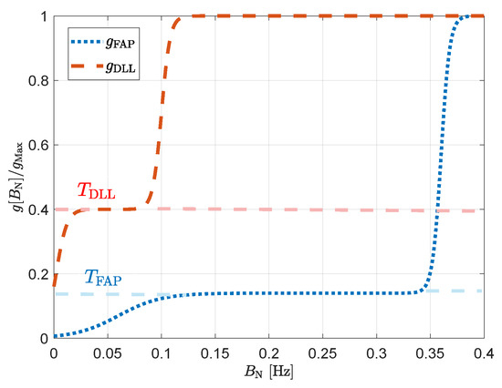 where is the ratio and is the ratio in Hertz. The variables and simplify the natural formulation to improve readability. Considering the assumption in Equation (11), the steady-state coefficients of the DLL are approximated to zero. The steady-state coefficients of the PLL and the FLL depend on , whereas the remainder coefficient of the DLL is dependent on . These two parameters determine the time of response of the full LUT-DSKF. Furthermore, the dependency of with indicates that, if PAD is enabled, the carrier phase error and the code phase error will have an influence on the code phase rate estimation (see Equation (6)).