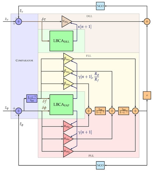 Two main findings can be addressed from the steady-state coefficients of the full LUT-DSKF. First, there is one single response time parameter for the FAP, significantly reducing the complexity of implementing an adaptive tracking technique. Second, the DLL has an additional time of response parameter . This parameter must be adapted independently, which implies an increase in complexity. In the following section, an extension of the LBCA adapts the time of response parameters of the full LUT-DSKF, .