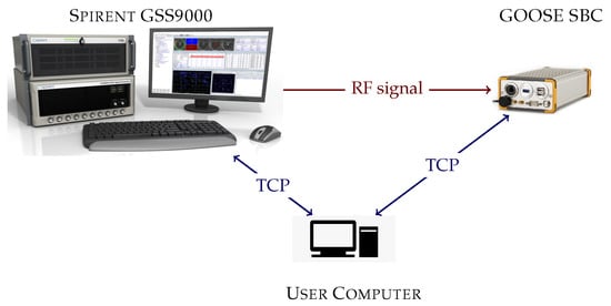 Figure 7 shows a block diagram of the evaluation setup. It is the same as in previous studies [25,31,34,37]. The setup consists of three main parts: the Spirent GSS9000 radio frequency constellation simulator (RFCS), the GOOSE SBC, and the user computer. The user computer manages the simulator and the GOOSE SBC through transmission control protocol (TCP) to perform the test automation. First, the user computer configures RFCS. It selects the desired scenario and sets the C/N0 to 50 dBHz to all the GNSS signals. A high C/N0 level is selected to ensure that all the visible SVs achieve tracking at the beginning of the scenario. Second, once the RFCS is ready and starts the simulation (), the user sends the application to the GOOSE SBC and commands the GOOSE to run it. Third, the user reduces the C/N0 level by 4 dB until reaching the desired C/N0 level. Finally, after 20 min of simulation (), the user stops the application that is running in GOOSE, collects all the logging data, and stops the simulation at the RFCS. The process repeats until evaluating all the desired C/N0 levels for all the applications, and for all the selected scenarios.