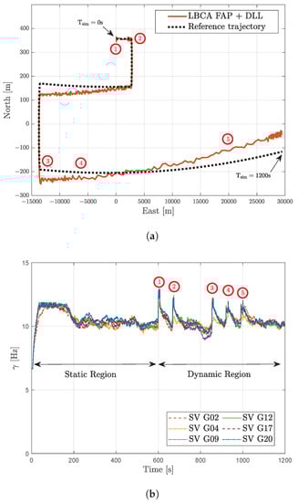 The carrier phase , carrier Doppler f, and code phase are the main parameters the GNSS receiver synchronizes with. Standard tracking techniques use scalar tracking loops (STLs) in the tracking stage. This tracking scheme synchronizes with a single synchronization parameter of a GNSS signal at a time [1,3]. Thus, a tracking channel includes three STLs: phase locked loop (PLL), frequency locked loop (FLL), and delay locked loop (DLL). The STL contains a correlator, a discriminator, a loop filter, and a numerically controlled oscillator (NCO) [4,5]. The configuration parameters of the STL include the discriminator type, the loop bandwidth B, the integration time , the order p, and the correlator spacing . These parameters determine the performance and robustness against noise and signal dynamics. The well-known trade-off between noise filtering capabilities and signal dynamics resistance is the main challenge of fix-configured STLs. In particular, this problem is aggravated in time-varying scenarios. These scenarios are characterized by different realizations of signal dynamics, noise, and fading effects that lead to challenges regarding synchronization capability [1]. For instance, a high-order STL with wide loop bandwidth and short integration time is adequate to track rapidly changing parameters. In contrast, a low-order STL with narrow loop bandwidth and long integration time is preferable to track noisy parameters. Therefore, a fixed configuration of the STL is a sub-optimal solution for time-varying scenarios.