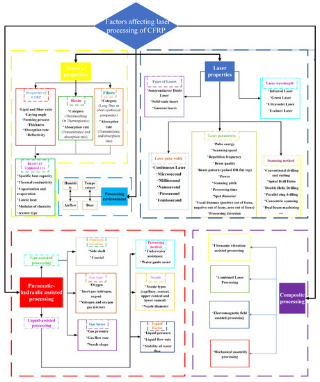 The first ruby laser in the world was created in 1960, and laser cutting was first used to drill holes in diamond molds in 1965. Since then, laser irradiation processing has been used to process materials in a variety of ways in industry. Tagliaferri et al. [23] investigated the laser processing of CFRP for the first time in 1985. In the past few decades, there have been both challenges and opportunities for the laser processing of composite materials. First, resin materials are classified as thermosetting and thermoplastic materials. Fiber-reinforced composites can be divided into short-fiber-reinforced composites with discontinuous short fibers as the reinforcing phase and long-fiber-reinforced composites with continuous long fibers as the reinforcing phase. Second, the physical properties of carbon fiber and epoxy resin differ greatly. For example, the gasification temperature of carbon fiber exceeds 3300 °C, whereas the resin begins to gasify at 500 °C. On the other hand, the thermal conductivity of the resin is only 0.2 W/(m·K), while the carbon fiber is anisotropic. The axial thermal conductivity (50 W/(m·K)) is much greater than the radial (5 W/(m·K)) [24]. Due to the variability of composite materials, laser processing can lead to severe thermal damage such as a heat-affected zone (HAZ), fiber pull-out, laminar delamination, and fiber-end expansion [25]. These damages not only affect the appearance and quality of the structure being machined, but also seriously affect the geometric accuracy and quality of the structure being machined, despite having a lower impact on the mechanical properties than the rest of the special and conventional machining methods. According to studies, the main reason for the decline in mechanical properties of CFRP is that HAZ makes the exposed carbon fibers unable to withstand the load. The bending strength, compressive strength, and tensile strength of CFRP all decrease linearly with the expansion of a HAZ region [17]. Because of the significant influence of the heat-affected zone, the size of the HAZ has now become a criterion for determining the processing quality of CFRP. According to the statistics of research in the field of CFRP laser processing carried out by EL-Hofy [26], the research on the HAZ accounts for 76.8%. Although it is nearly impossible to get undamaged CFRP samples in laser processing, the quality of the samples can be improved by optimizing the process parameters (laser pulse width, wavelength, scanning speed, etc.) [27]. Carbon fiber can endure relatively high temperatures, while the resin matrix will experience mechanical degradation as temperature increases. The resin is prone to water absorption and deliquescence, which causes the expansion of the HAZ during processing and lowers the processing quality [28,29,30,31]. Shorter wavelengths and narrower pulse widths can lessen the thermal impact and thermal diffusion damage. The gas- and liquid-assisted laser processing can be used to cool the processing area and reduce heat accumulation. The width of the HAZ during the laser processing of CFRP can be influenced by a variety of factors. Figure 1 provides an overview of the factors influencing laser processing.