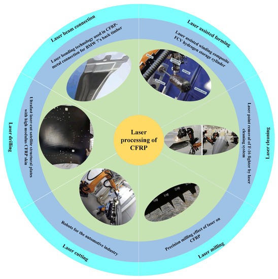However, for continuous lasers and millisecond or even nanosecond short-pulse lasers processing, the thermal damage region is large. As a new processing technology, ultrashort pulse laser processing with extreme physical characteristics, such as picosecond laser and femtosecond laser, has the advantages of tiny scale, strong controllability, environmental friendliness, no restriction of material types, non-contact processing, and no heat transfer. Currently, laser processing has emerged as a viable method for overcoming the technical barrier of the precision processing of fiber-reinforced composites. This technology has been successfully applied to surface cleaning and activation, surface metallization, and other manufacturing techniques, meeting new requirements like connection or functional surface preparation. It is anticipated that laser processing can overcome the shortcomings in processing accuracy and damage. Nowadays, laser processing on CFRP has a wide range of applications, such as drilling, cutting, milling [32], cleaning, connecting [33], auxiliary molding [34], and other processes [35], as indicated in Figure 2.