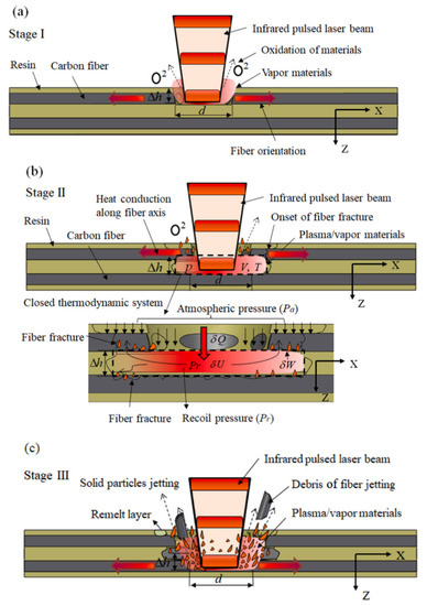 Schematic diagram of material removal for different stages in pulsed-laser machining of CFRP composites: (a) stage I; (b) stage II; (c) stage III [36].