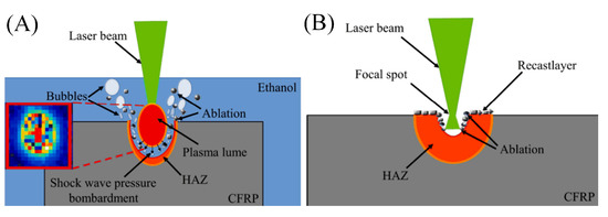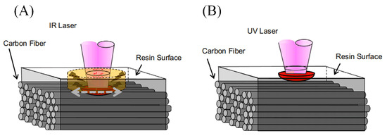 Laser cutting process of CFRP, which depends on the wavelength of the laser: (A) infrared laser and (B) UV laser processing CFRP mechanism [40].
