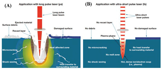 Schematic processing comparison of microsecond to femtosecond lasers: (A) long-pulse laser and (B) femtosecond laser processing [42].