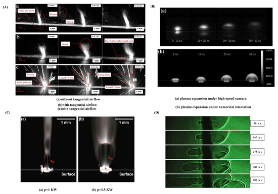 Plasma expansion of laser-processed CFRP captured by high-speed camera: (A) plasma in various air ambiances [36]; (B) burning waves at various pulse counts [47]; (C) diagram of a plasma plume in smoke [46]; (D) the phenomena of mushroom-like eruptions [45].