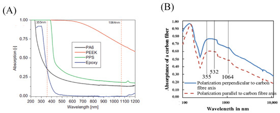 Absorption rates of different wavelengths of light by carbon fiber and epoxy resin respectively: (A) absorption spectra of resin materials [50]; (B) the average absorption curves of single carbon fiber for different laser wavelengths [51].