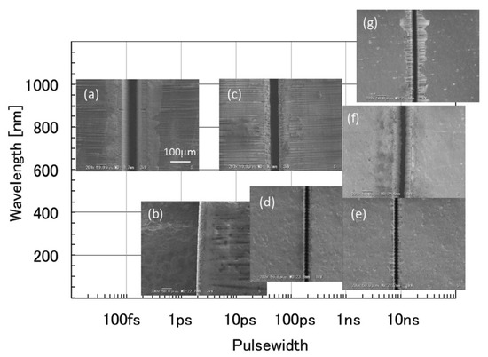 Processing morphology with different wavelengths and pulse widths, (a) the pulse width and wavelength of the laser beam of-(g) are respectively: (a) 180 fs, 800 nm; (b) 35 ps, 800 nm; (c) 200 ps, 800 nm; (d) 2 ns, 355 nm; (e) 10 ns, 355 nm; (f) 10 ns, 532 nm; (g) 20 ns, 1064 nm [68].