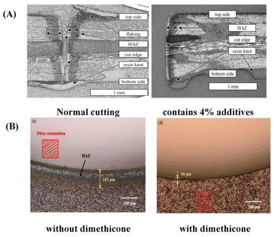 The effect of auxiliary agents on laser processing: (A) CFRP morphology after carbon-black-assisted laser processing and conventional laser processing [94]; (B) CFRP morphology after dimethylidene-ketone-assisted laser processing and conventional laser processing [95].