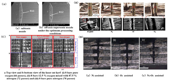 Effect of different auxiliary gases on laser processing of CFRP: (A) two different kinds of nozzle processing [97]; (B) cross-section view of different gas processing CFRP sample processes [98]; (C) the effect of gas processing with different contents [99]; (D) different gas processing [100].