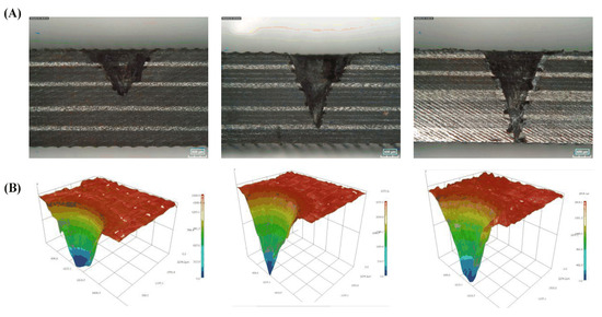 Wang et al. [104] processed CFRP using a water-guided laser. The research results showed that the cutting surface of CFRP processed by a water-guided laser was clean and flat. In addition, there were almost no fused impurities attached to the cutting surface and groove, as shown in Figure 15A. Additionally, the surface heat-affected zone, material delamination phenomenon, and fiber expansion were all improved. The cooling effect of the paraxial water jet was exploited by Zhang et al. [105] to restrict the diffusion of excess heat produced during laser processing. As can be seen from the morphology of Figure 15, the smaller the heat-affected zone was, the more water was flowing through the system (B). Water-jet assist can not only achieve timely heat dissipation but also improve the cutting surface processing quality of carbon fiber and reduce carbonization.