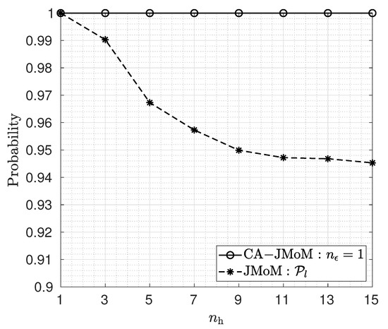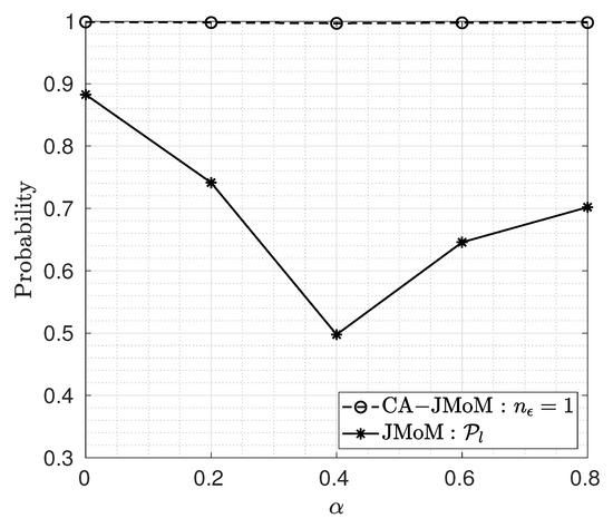 where α [ 0 , 1 ] , and U [ b 1 , b 2 ] denotes the continuous uniform distribution in the range of [ b 1 , b 2 ] . The performance of the JMoM and the CA-JMoM estimators for different values of a is depicted in Figure 7. As seen, the performance of the JMoM estimator degrades in the presence of PDP estimation error. However, the CA-JMoM is robust to the PDP estimation error.