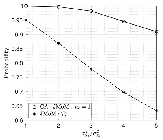The effect of the users’ power ratio, i.e., c = σ x 1 2 / σ x 2 2 , on the performance of the JMoM and the CA-JMoM estimator is shown in Figure 8. On the contrary to the SIC [28], the highest lock-in probability is achieved when the power is distributed equally between the users, i.e., c = 1 . The reason is that the signals in this situation are most distinguishable in terms of variance. As the gap between the users’ powers, increases, the signal with the lower power hides within the signal with a higher power, and hence, the performance degrades.