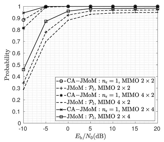 Figure 9 shows the performance of the JMoM and the CA-JMoM estimators for two users equipped with multiple transmit antennas. The BS also employs multiple receive antennas. The number of OFDM symbols used for estimation for 2 × 2 , 2 × 4 and 4 × 2 multiuser MIMO scenarios, are 80, 60 and 60, respectively. As seen, the lock-in probability can be improved by employing multiple receive antennas. The higher number of antennas at the receiver achieves higher estimation accuracy because of the spatial diversity. On the other hand, the more number of antennas at the transmitter results in self-interference and thus performance degradation. The higher estimation accuracy for the multiple receive antennas allows a lower number of observation samples. We also observe that the gap between the JMoM and the CA-JMoM estimators decreases in the case of multiuser MIMO.