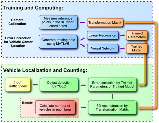 The overall workflow of the proposed vehicle localization method is shown in Figure 1. In the figure, it is shown that the camera calibration is conducted, and error correction models are developed in the training and computing phase. The resulting models are then applied to the input traffic video in the vehicle localization and counting phase to evaluate the effectiveness of the proposed method.