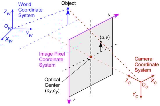 where is the focal length, and are the coordinates of the optical center of the camera, which may not coincide with the center of the image coordinate system. The relationship between the 2D image coordinates and the 3D camera coordinates can be represented by: