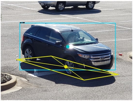 There is an inherent geometrical error in obtaining the vehicle center location in the world coordinates from the corresponding 2D image coordinates that YOLO provides. When YOLO detects a vehicle, it draws a bounding box around the vehicle and the center of the bounding box is regarded as the center of the vehicle. However, due to the angled view of vehicles by the traffic camera, the center of the bounding box does not match with the true center of the vehicle on the road. This error can be explained using the vehicle shown in Figure 3, where the center of the bounding box is shown as a blue dot and the true center of the vehicle is shown as a yellow dot. Note that the yellow dot is at the intersection of the diagonals of a parallelogram obtained by projecting the vehicle onto the ground.