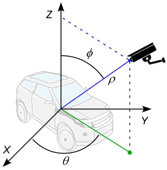 Vehicles at different locations seen by a fixed camera appear in different sizes and orientations. In the spherical coordinate system, a vehicle can be represented by two observation angles, and 𝜙, and distance, , as shown in Figure 4 [31]. The error of the vehicle center location caused by the varying view angles and distance can be represented and thus corrected by these variables.